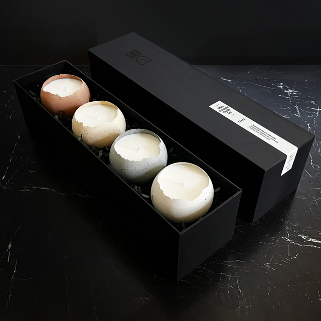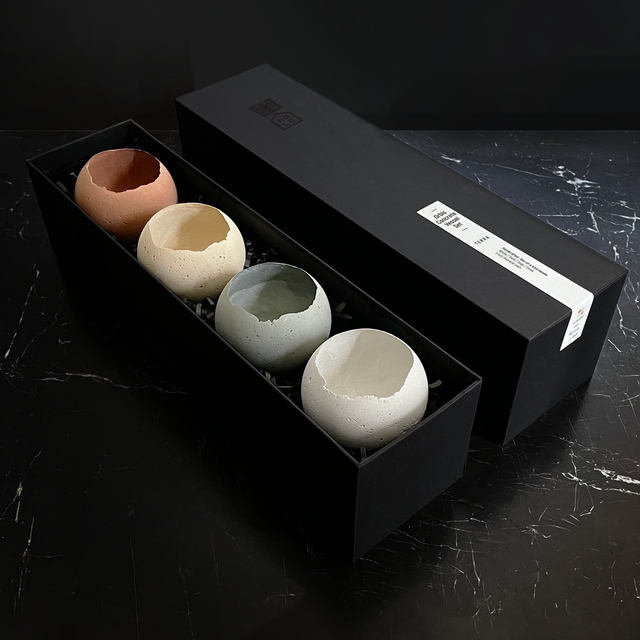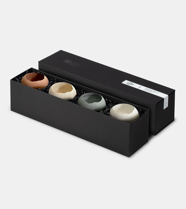 Four concrete vessels in shades of grey are displayed in a luxurious box set.