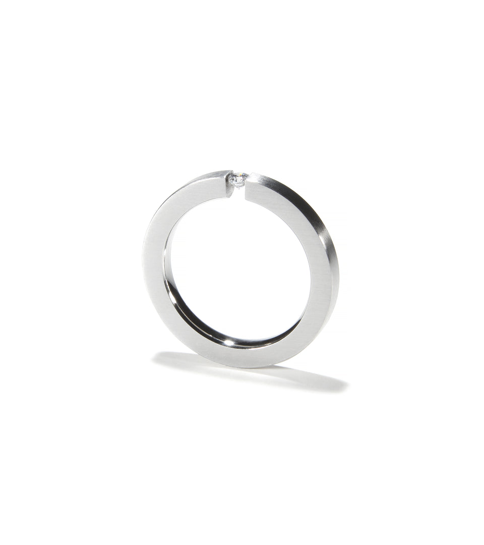 A .05ct or 2.5mm diamond is tension set into a simple 2.5mm wide band. All diamonds are F in color and Vs2 in clarity.