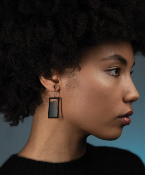 The Elena earrings play with light through a sleek, elongated form. A vertical resin plane reveals a smooth gradient that shifts from light to shadow, bringing subtle movement to the piece. The translucent resin captures and softens light, creating a quiet glow within the structured black frame. Derived from the Greek Helene, meaning “shining light,” the name reflects the subtle luminosity within each resin form. The Elena earrings bring a sculptural elegance that feels both contemporary and timeless.
