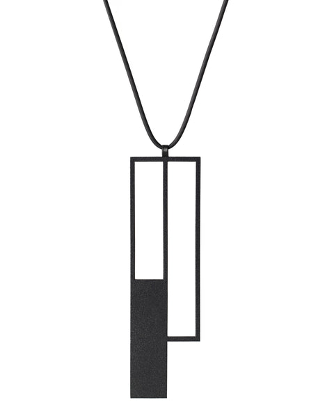 This pendant takes the vertical composition to its most dramatic expression, with elongated rectangular frames creating an almost columnar presence. The offset alignment and strategic placement of solid and void planes generate a powerful linear statement that extends significantly downward. This piece is for the bold—its substantial length makes it a true statement of artistic confidence, transforming jewelry into wearable architecture that demands to be noticed while maintaining the collection's essential restraint and precision.