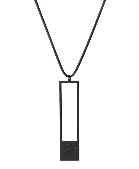 This pendant explores the balance between solid and void through a slender vertical form. The solid lower half creates visual weight and grounding, while the upper half remains an open frame—a study in contrasts that suggests foundation and aspiration. The clean bisection creates a horizon line within the composition, dividing mass from emptiness in a gesture that feels both architectural and poetic.