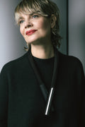 The Unity x22s necklace is identified by intersecting concrete and stainless steel columns that hang from elegant satin black double braided nylon rope. The two columns unite via rare-earth magnets.
