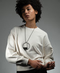 This pendant amplifies the quartered circle design with expanded dimensions that create a more commanding and dramatic presence. The larger scale emphasizes the perpendicular division and L-shaped solid mass, making the interplay between filled and open quadrants more visible and striking. This necklace offers bold versatility—powerful enough to anchor an outfit yet refined enough for any occasion, with its lightweight open framework ensuring all-day comfort. The durable powder-coated stainless steel construction and timeless architectural design make it a lasting investment piece that creates a strong sense of presence and grounding for the wearer.