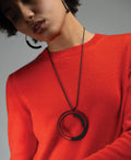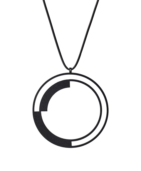 This pendant amplifies the dramatic impact with its increased scale, making the concentric circles and their segmented interplay more commanding and visible. The larger diameter emphasizes the spatial relationship between the complete outer ring and the divided inner circle, turning the subtle rhythm of the smaller version into a bolder statement. For the wearer, this size creates a more significant presence—it becomes an anchor point that draws attention while the open framework maintains lightness. The expanded circular form feels confident and encompassing, offering a sense of completeness and movement that can make the wearer feel centered yet dynamic, grounded in the piece's geometric harmony while still connected to its suggestion of motion and change.