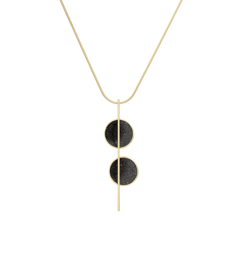 Bauhaus inspired geometry in a simple elegant necklace, the Arago Minor necklace features two circular concrete with diamond dust domes elegantly bisected by sleek gold bars, creating a sophisticated geometric composition suspended from a delicate gold chain. The striking contrast between the raw, textured concrete and lustrous gold creates visual drama while maintaining refined minimalism. The vertical alignment of the elements draws the eye along the neckline with graceful linear movement, while the durable materials ensure the piece maintains its beauty over time. This contemporary design appeals to those who appreciate modern, architectural jewelry that balances industrial edge with precious metal elegance.
