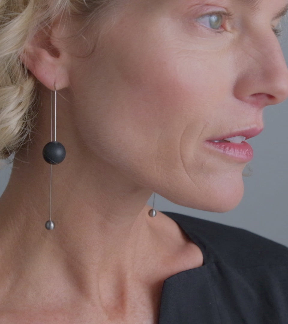 The earring post innovatively nests into the concrete ball creating a visually uninterrupted line up from the concrete sphere down to the stainless sphere.