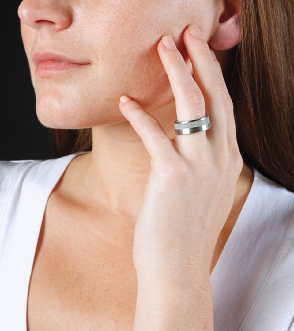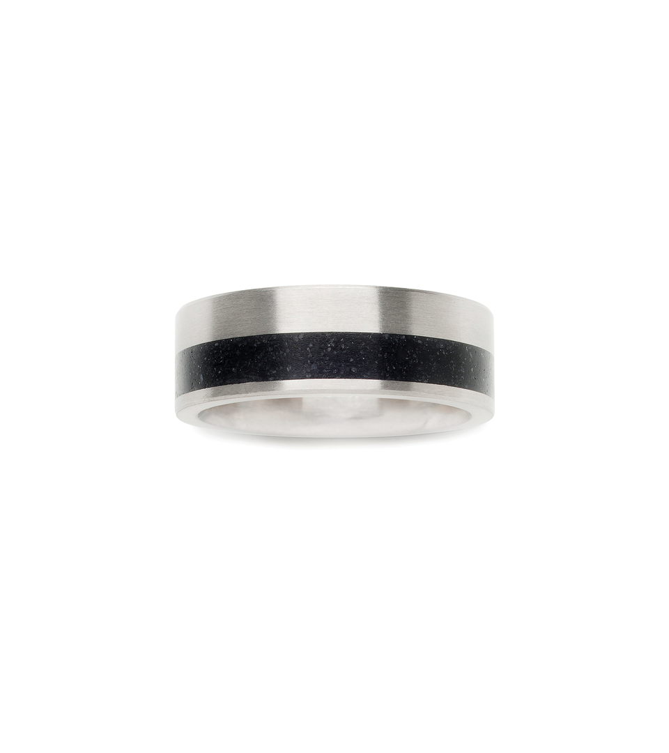At 8mm wide, this concrete and stainless ring features an offset concrete detail at 3.5mm wide. Sizes available 5 – 12. Custom sizes available for an additional charge, please email for details.
