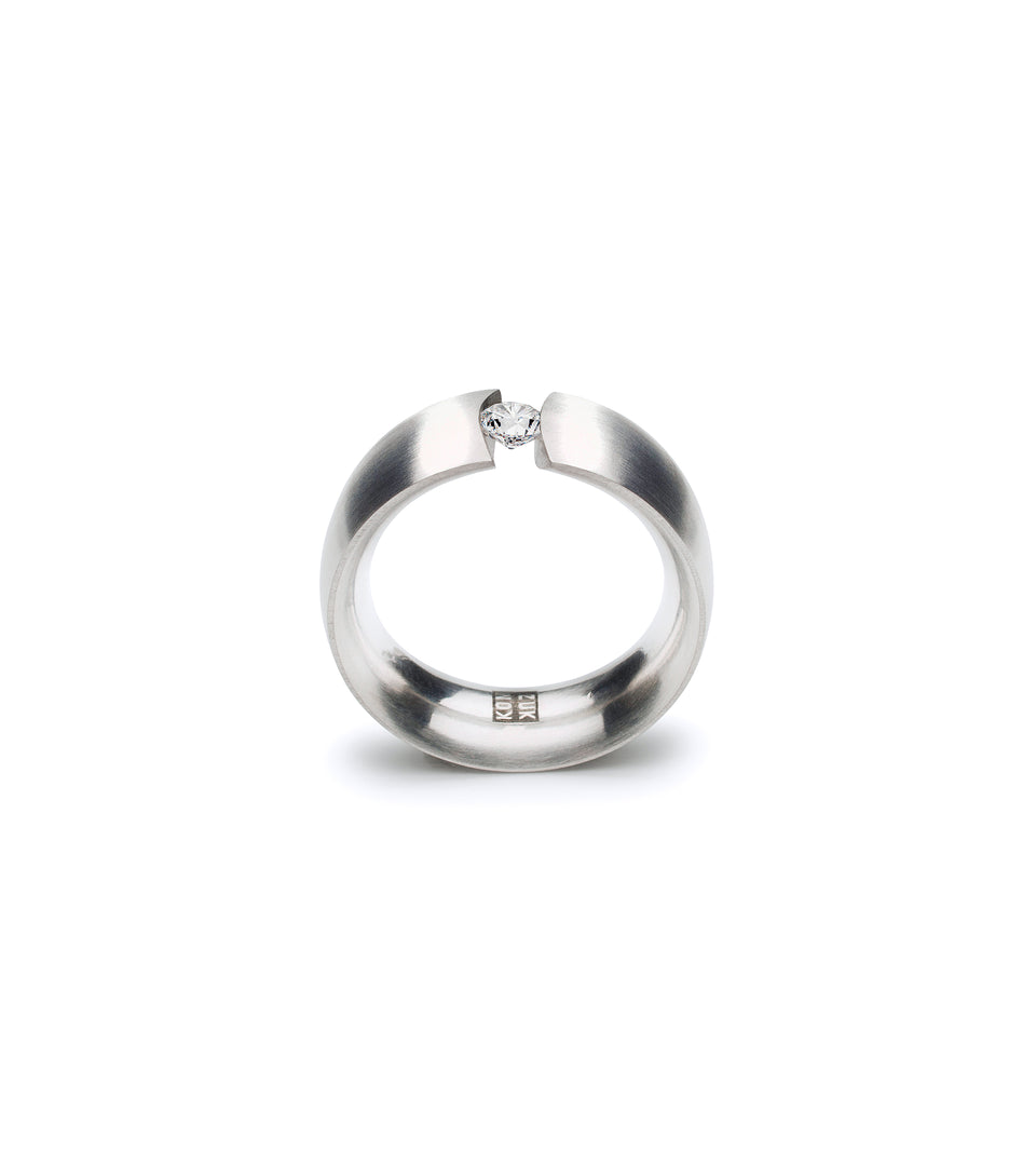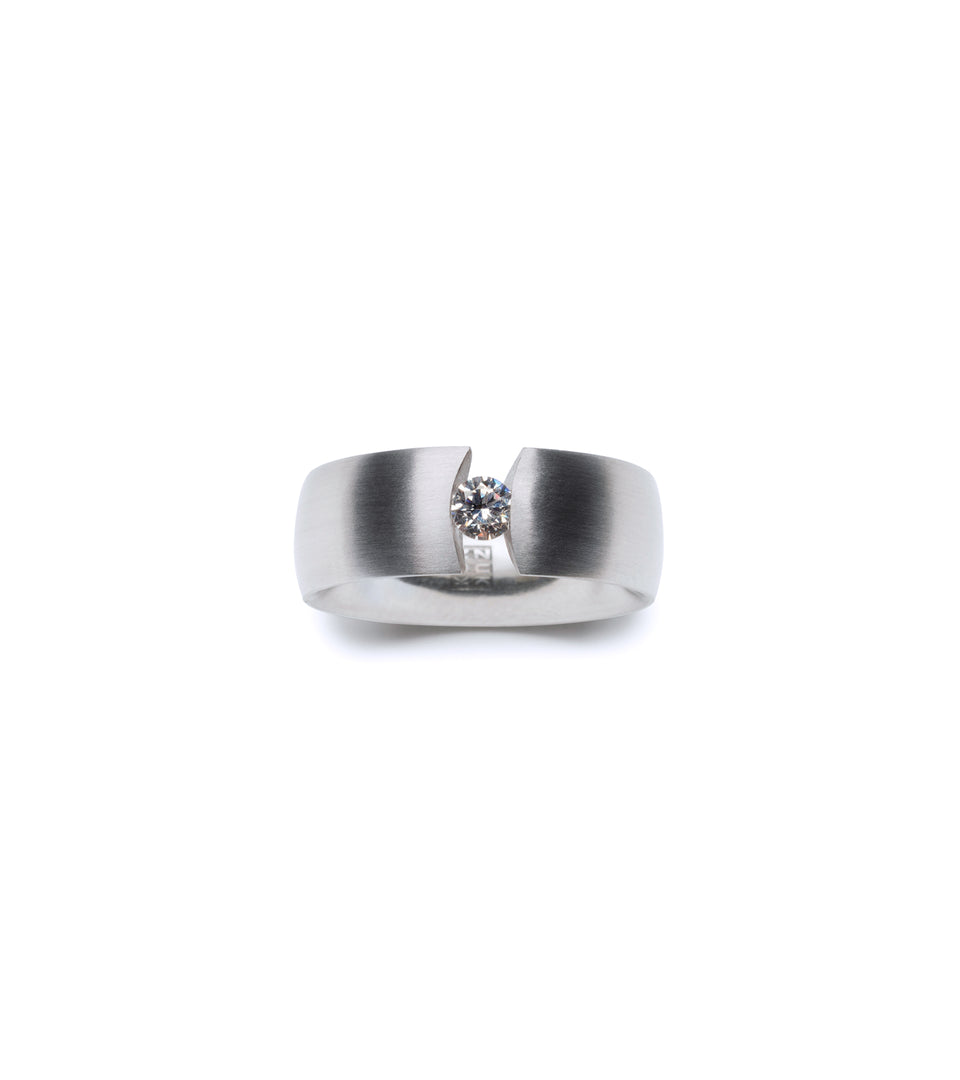 A beautiful rounded stainless steel band holds a .25ct diamond tension-set in a slightly curved setting. Extremely comfortable to wear and shows off the diamond perfectly.