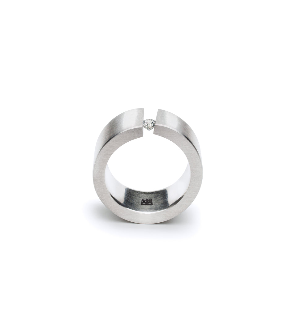 This architecturally inspired ring features a wide band design with offset brushed metal panels that frame a .10-carat diamond in a contemporary tension setting, available in stainless steel or platinum. The clean geometric lines and substantial form create a modern aesthetic where negative space becomes part of the design, drawing attention to the diamond suspended at the center. The brushed finish adds sophisticated texture while the precision engineering ensures the stone is securely held within the minimalist framework. This distinctive piece appeals to those who appreciate jewelry inspired by architectural principles, where structural beauty and functional design unite to create a bold statement that celebrates both form and craftsmanship.
