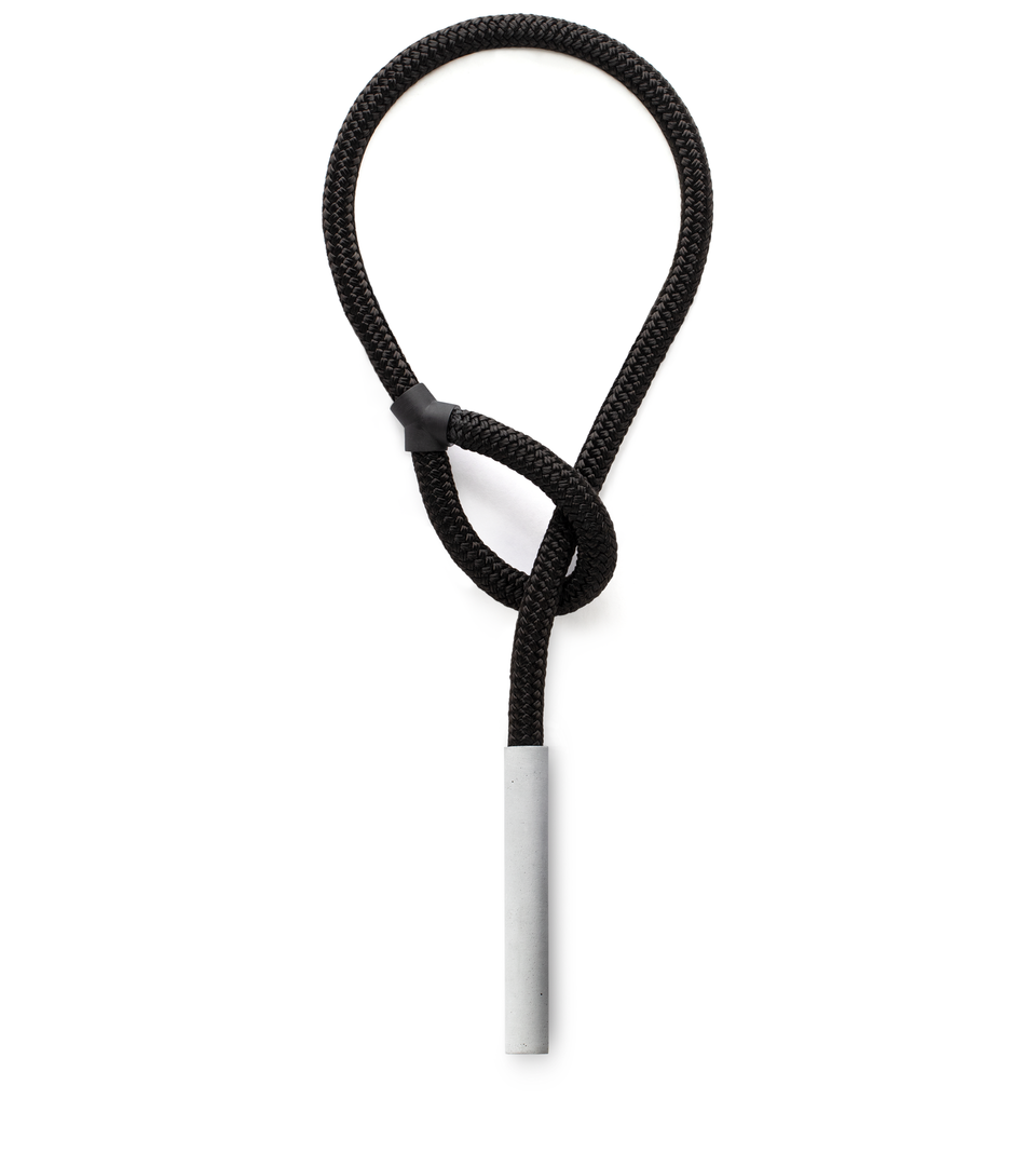 A contemporary symbol of unity, the Unity Thread 17 necklace is a figurative offshoot of human connection and our ability to create memories. The disconnect in the world inspired Karen to craft a captivating concrete pillar suspended from a double-braided black nylon rope that threads through the loop over to the other side. Just as more threads sewn together result in a stronger material, the fabric of society strengthens when people come together.